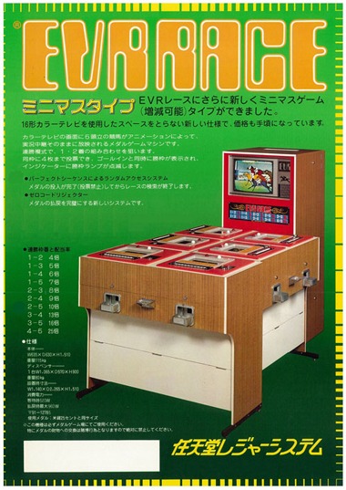 Released in 1975, EVR Race was Nintendo’s first entry into the video arcade game market. Created by Genyo Takeda, EVR Race was an extremely large unit and could be played by six players simultaneously. The premise of the game was simple: horses would race on-screen and players would predict which horse would be the winner.