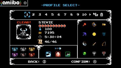 Custom Knight is only available in the Shovel of Hope Campaign. In this extra campaign, you can scan your Shovel Knight Amiibo at any time from the file select screen or map screen, and level him up. As you collect gold, he gains levels. Every so many levels, he gains random power ups. These range from Health/Magic Upgrades, to random relics, to aesthetic changes. And the best part? It’s all RANDOM.