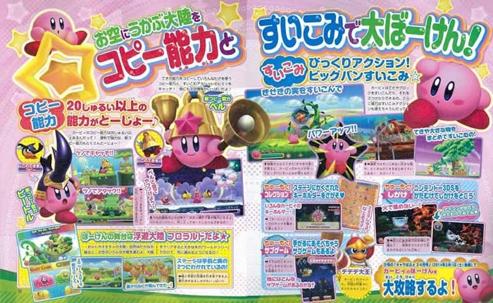 A few details for Kirby: Triple Deluxe have emerged from various Japanese magazines recently. The scans of the upcoming 3DS Kirby title reveal some interesting features such as tilting the handheld for puzzles and a new bell and beetle power up. The scans were first shown through a post on NeoGAF with a user helping on the translations.