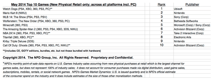 The NPD released their software sales data for the month of May 2014 yesterday, and Mario Kart 8 made some noise. The eighth iteration in the popular kart racing franchise was the second best selling game last month, finishing behind the multiplatform Ubisoft title, Watch_Dogs. The results to last month’s NPD is a bit surprising on Mario Kart 8’s behalf, as the game was out for only two days in May. Still, for a short amount of time on store shelves in May it’s still an impressive feat for both Nintendo and the Mario Kart franchise.