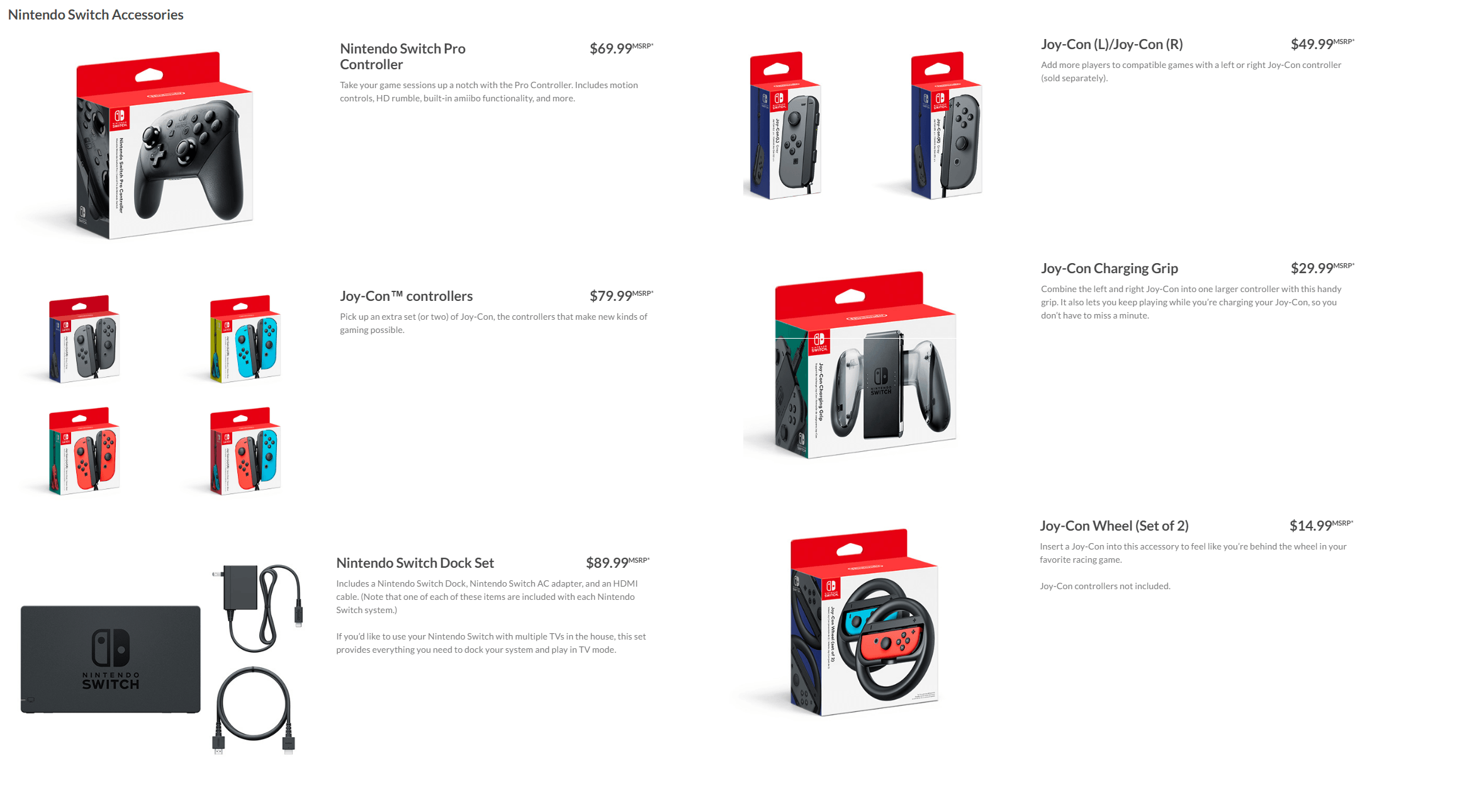 Assuming one would want to add an additional Joy-Con (L) & (R) for multiplayer, a Joy-Con Charging Grip (the non-charging version does not appear on Nintendo’s website for purchase), and an additional Nintendo Switch Dock, the retail price has already reached $199.97 in accessories alone.