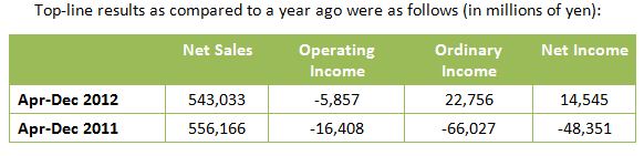 Nintendo’s third-quarter financial results are in, covering the first nine months of its fiscal year (through December 31st). The 3DS hardware did see a sales increase (up 11% Year on year), and the software saw a significant increase (up 41% Year on year). However, those sales increases were not enough to offset the loss experienced by the Wii and DS (hardware and software). The company has returned to profibility, though, due primarily by foreign exchange currency exchange gains.