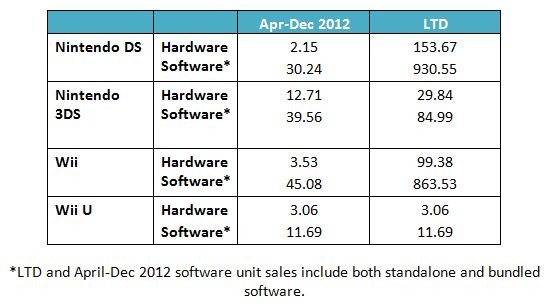 Through the first nine months of the fiscal year (period ending December 2013), Nintendo has shipped 21.45 Million hardware units and 126.57 Million software units worldwide! The global sales are broken down below in millions of units and are categorized by Hardware/software as well as fiscal year units and lifetime units: