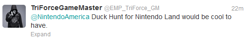As I scrolled through my Twitter feed I noticed a tweet from @EMP_TriForce_GM telling Nintendo of America that Duck Hunt for Nintendo Land would be cool. I have to agree, it would be pretty fantastic.