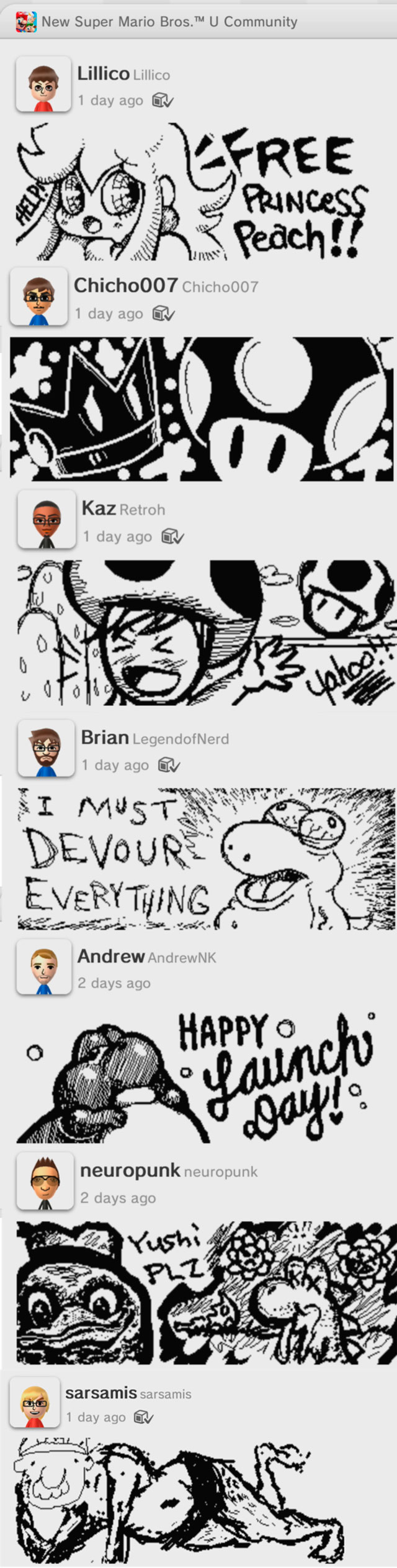One of my favorite things about the Wii U is the varied quality of artwork that members post. Some show their frustration, some show their victories, some show their inner Michelangelo. Below are some examples of what people have posted. Kotaku posted many more on their page. If you see some unique, funny, or out of this world posts, feel free to post them on our Facebook page.